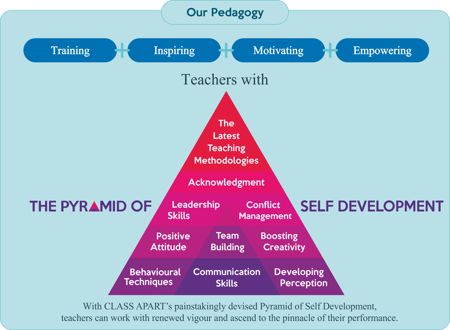 CLASS APART is a focussed, short duration training program, designed for teachers. It aims specifically at improving a teacher's Effectiveness through Self Development.